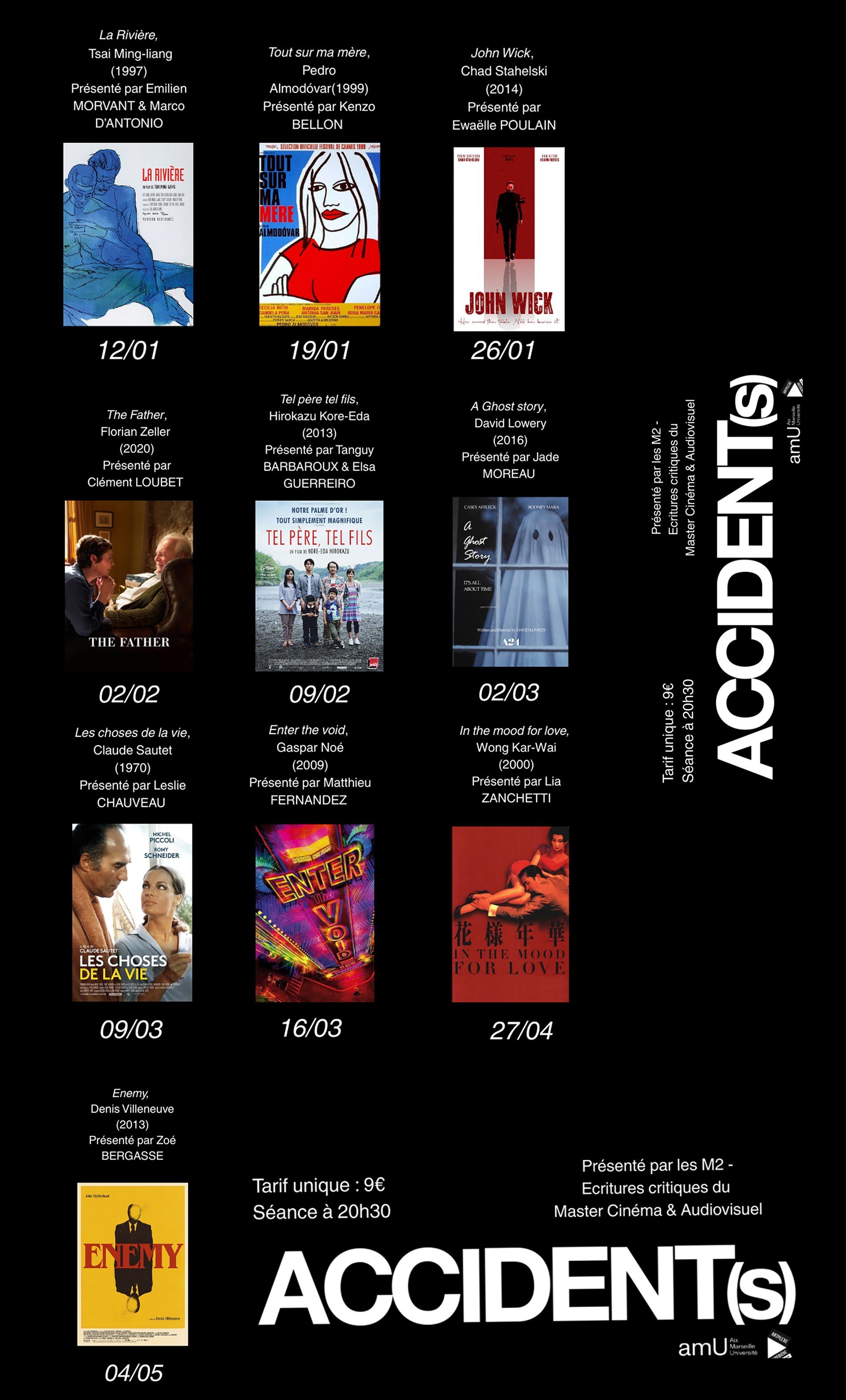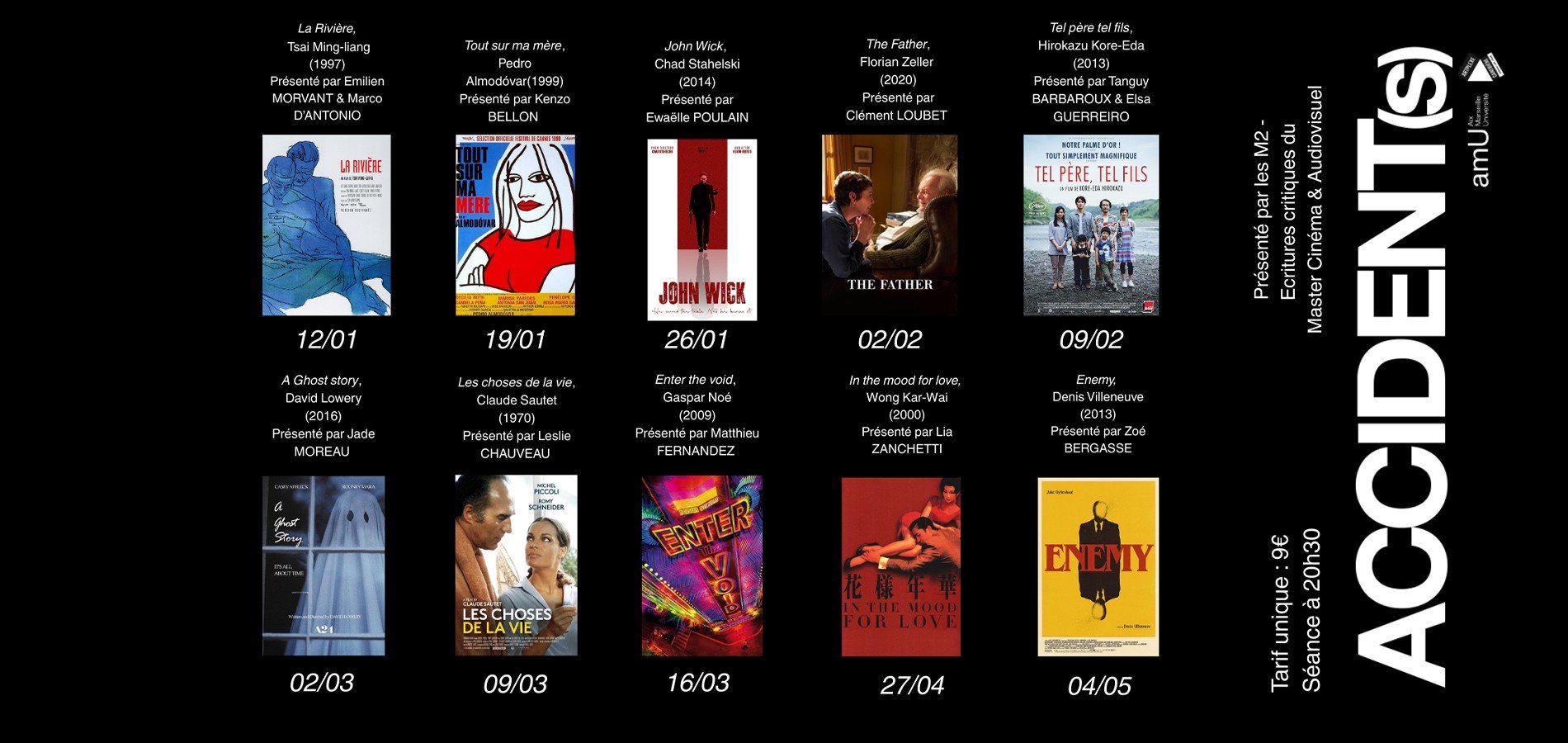 Les étudiants en master 2 Cinéma du parcours "Écritures critiques" (Aix-Marseille Université) s'associent à nouveau au Cinéma "Artplexe Canebière" pour proposer une programmation de 10 films autour d'une thématique. Cette année, la thématique est nommée "Accident(s)" :