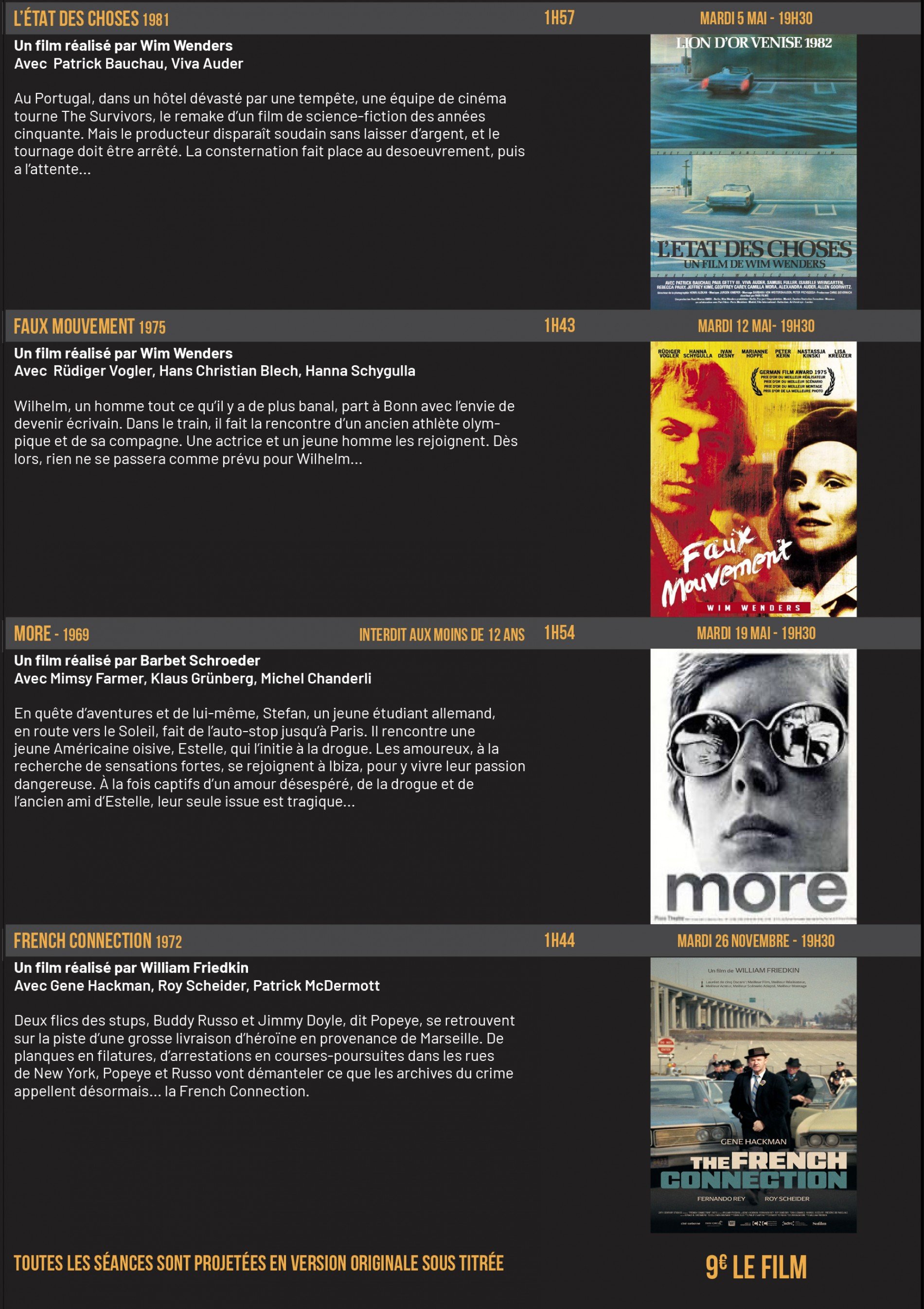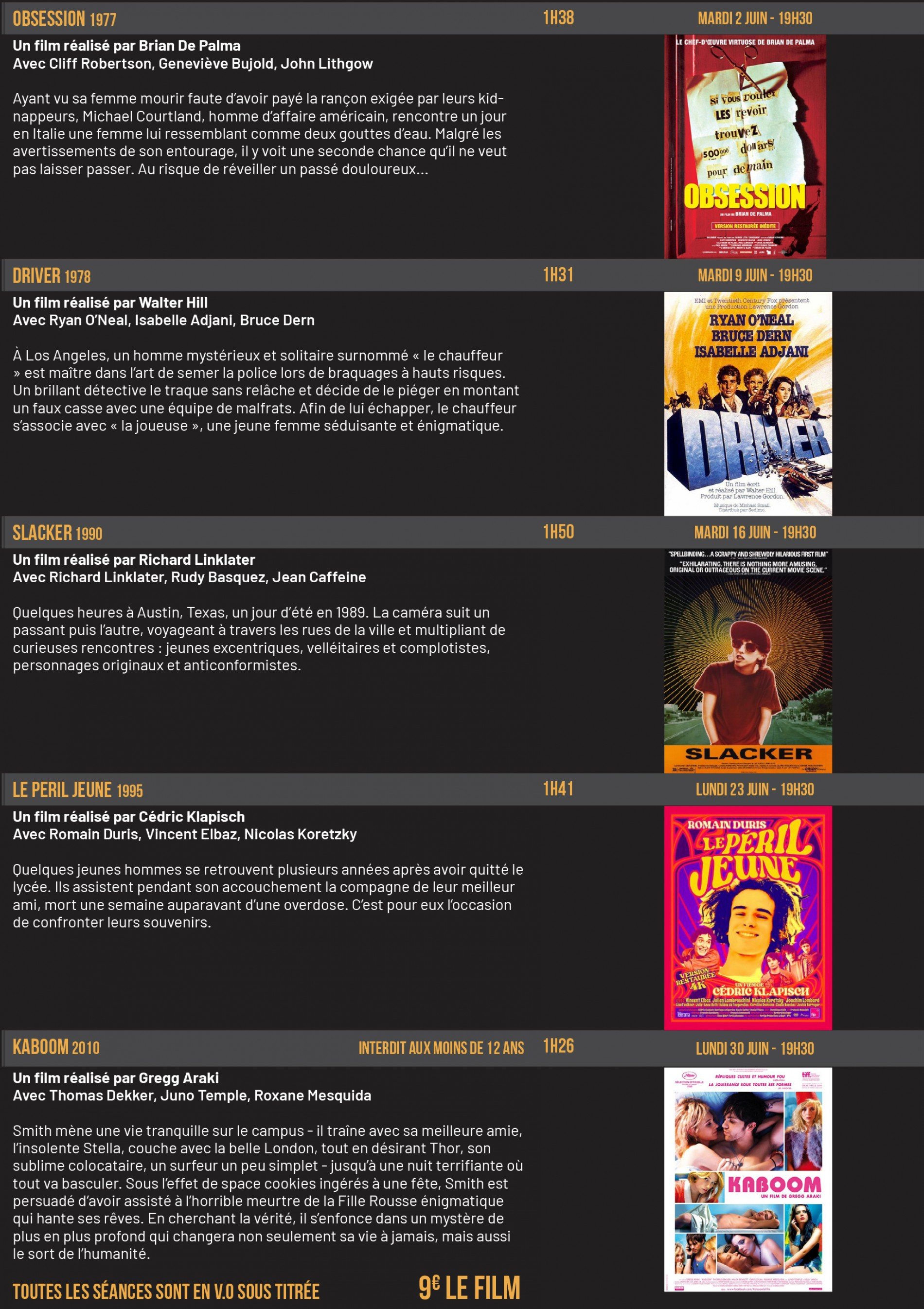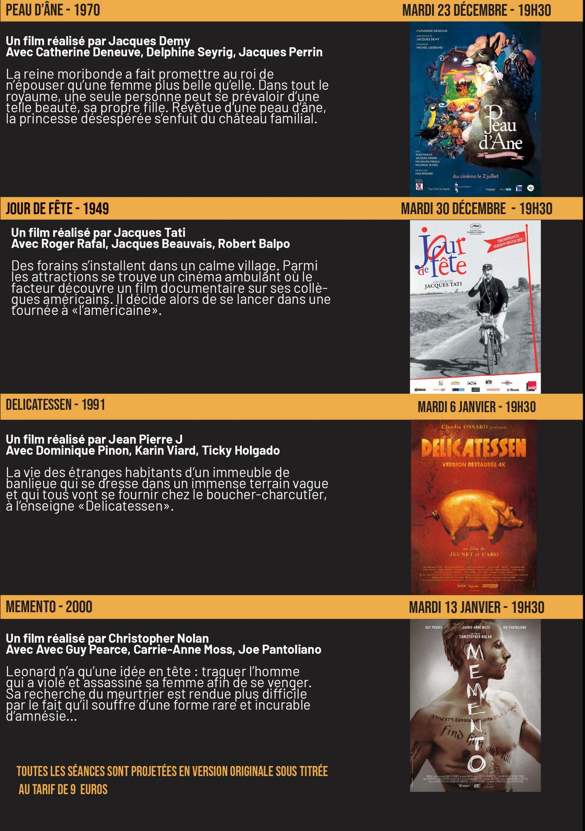 Chaque séance sera bien évidemment proposée en version originale sous titrée en français pour les films initialement tournés en langue étrangère.