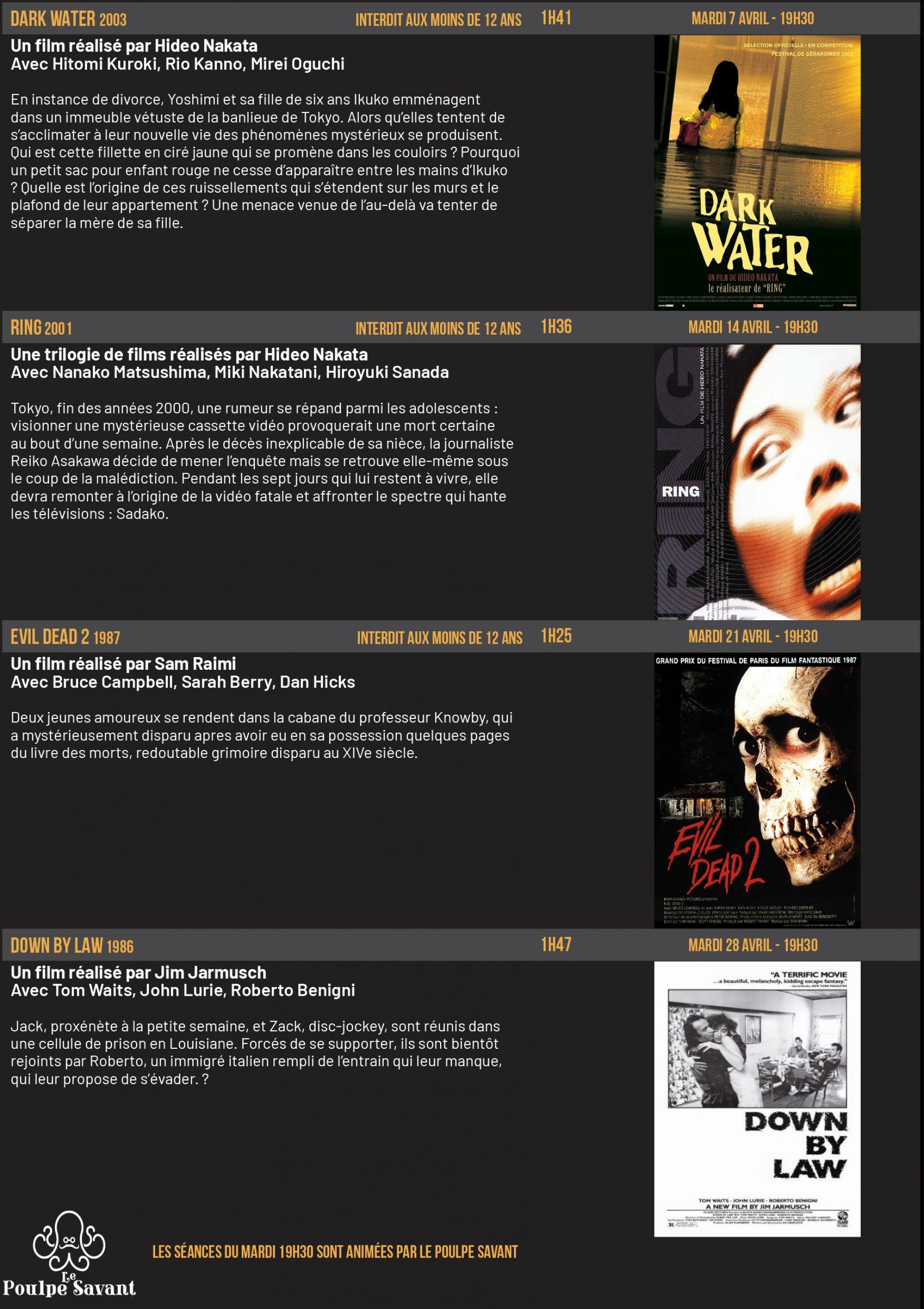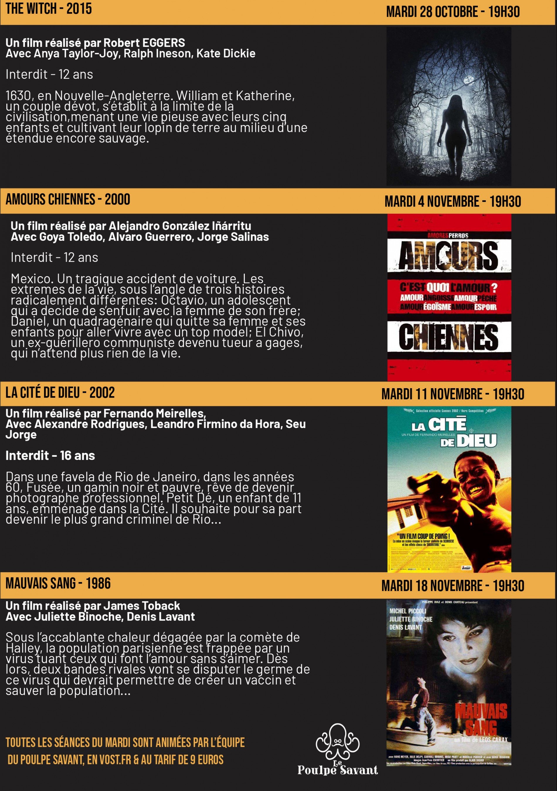 La séance du mardi soir est présentée et animée par nos amis du Poulpe Savant...( sauf du 21/7 au 9/9) que vous soyez un cinéphile averti ou un nouveau venu, vous pourrez échanger avec eux et entre vous autour du film. Chaque projection devient ainsi un moment de convivialité avec d'autres passionnés, dans une atmosphère chaleureuse et les débats cinéphiles seront passionnants.