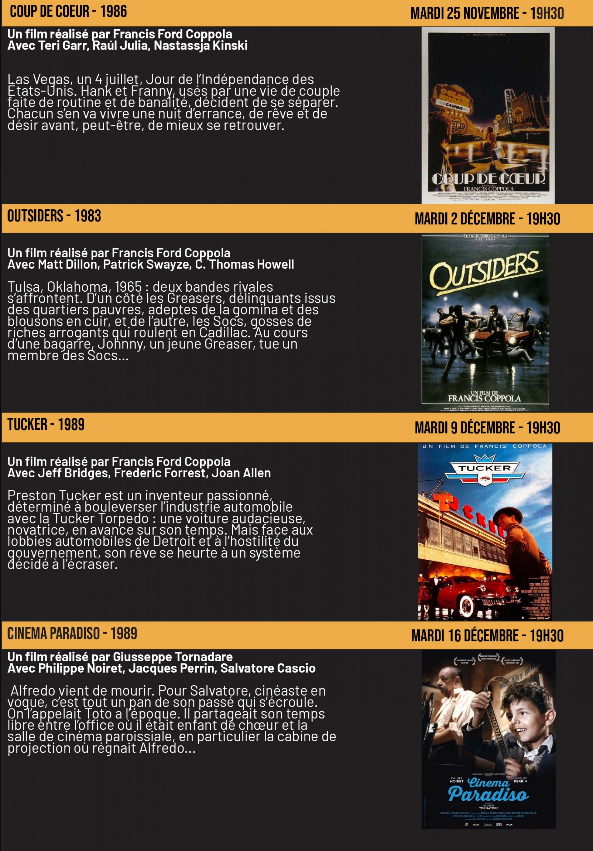 Un film par semaine, diffusé au minimum deux fois : le mardi à 19H30 ainsi qu'une ou plusieurs autres séances à des horaires variables en fonction du film.
